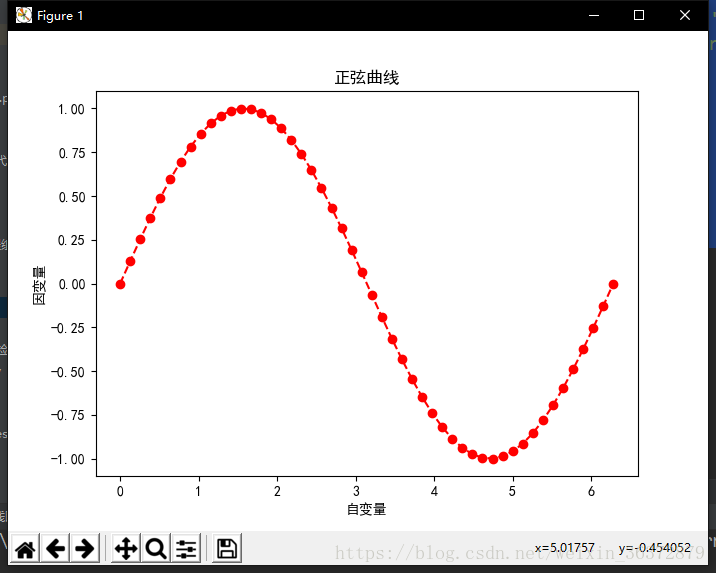 import numpy as np from matplotlib import pyplot as plt plt.rcParams['font.sans-serif'] = ['SimHei'] # 用来正常显示中文标签 plt.reParams是一个配置表 plt.rcParams['axes.unicode_minus'] = False # 用来正常显示负号 plt.figure(figsize=(7, 5)) x = np.linspace(0, 2 * np.pi, 50) y = np.sin(x) plt.xlabel(u'自变量') plt.ylabel(u'因变量') plt.title(u'正弦曲线') plt.plot(x, y, 'ro--') #红色圆圈加虚线 plt.show()
