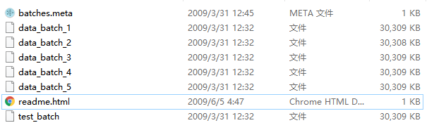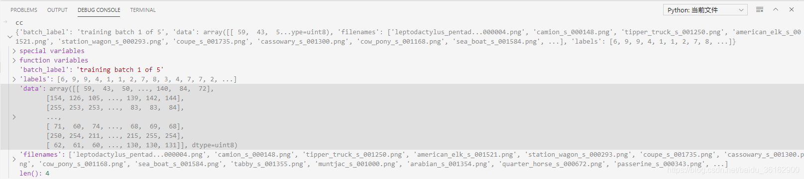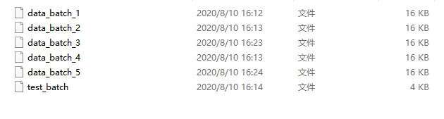 其中data_batch就是用于训练的数据集,一共有五个;test_batch就是用于测试的数据集,一共有一个;batchs.meta其中包含的信息是类别名称,下面我们就仔细看看各个文件包含的具体内容: