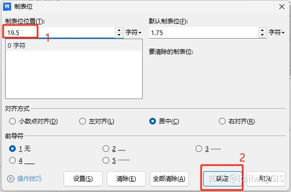 3.2 按图3-1所示操作再次进入制表位设置界面,设置居中制表位,字符19.5,然后点确定