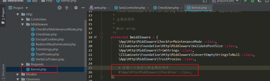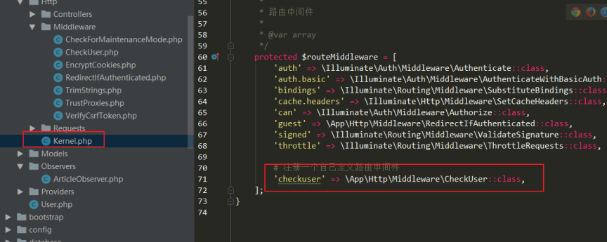该文件包含两个属性: $middleware 和 $routeMiddleware。$middleware 属性用于注册全局中间件,$routeMiddleware属性用于注册路由指定中间件。