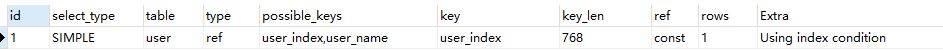 这种情况,效率明显就很高, 用到索引,possible_key指可能用到的索引,key表示用到的索引。