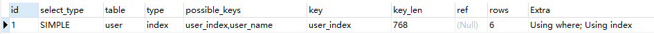 这种情况没有上面的情况效率高,虽然说用到了索引,但是type类型是index级别的。Extra:Using index 指的是不用回表操作,用到索引覆盖。