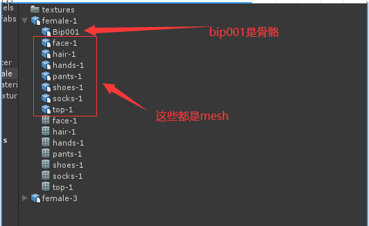 这些mesh中资源包含网格、材质和骨骼信息