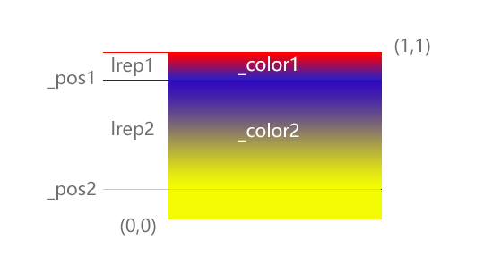 _color1 - color2中的过度色,由0 -_pos1的比值定位,注意uv坐标系中左下角是原点右上角是重点,所以获取0 -_pos1的比值时需要用1减去。否则就是倒置的效果。