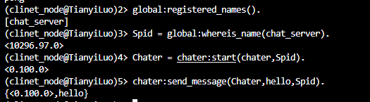 - 在server_node启动chat_server,在client_node查询Spid,启动chater,执行send_message方法,得到单点一样的结果: