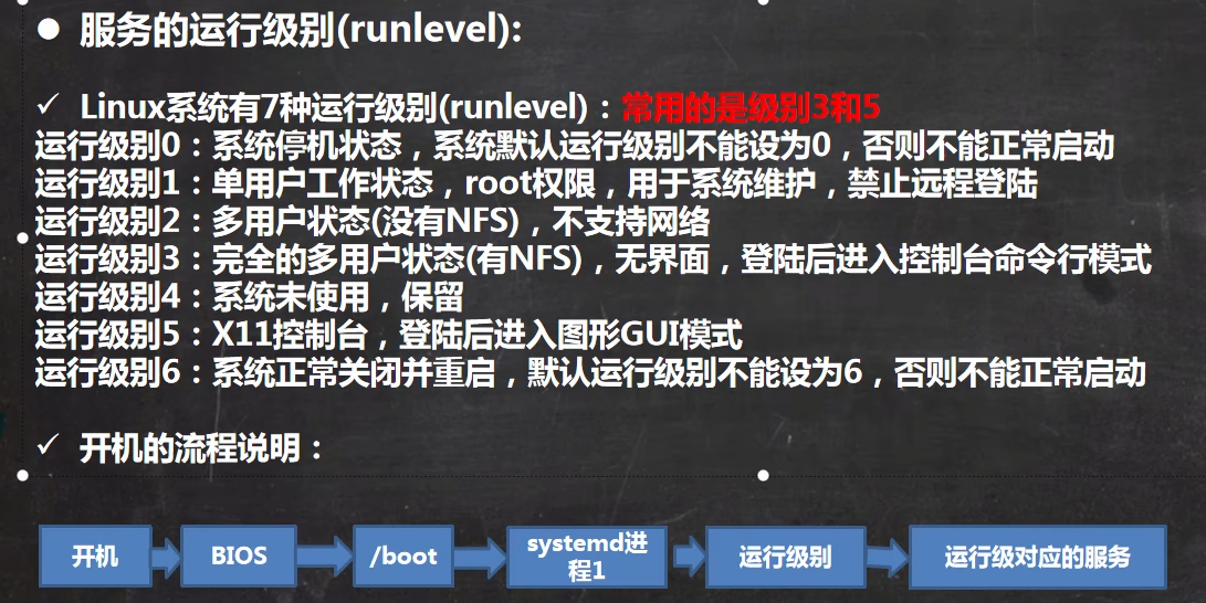 - chkconfig --list :查看服务在各运行级别下自启动/关闭情况
