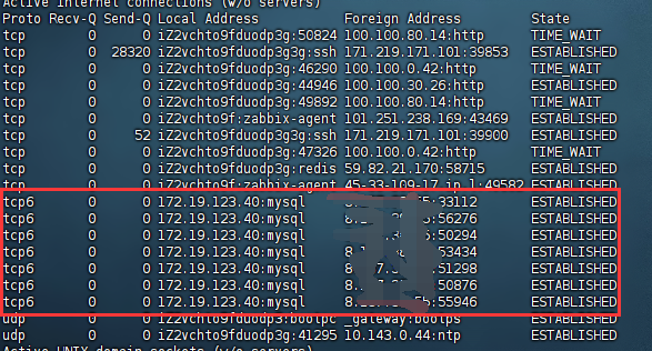 远程地址与本机mysql建立了多个连接。