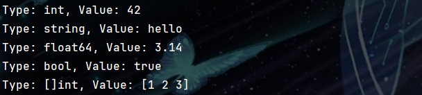fmt.Printf("Type: %T, Value: %v\n", value, value)