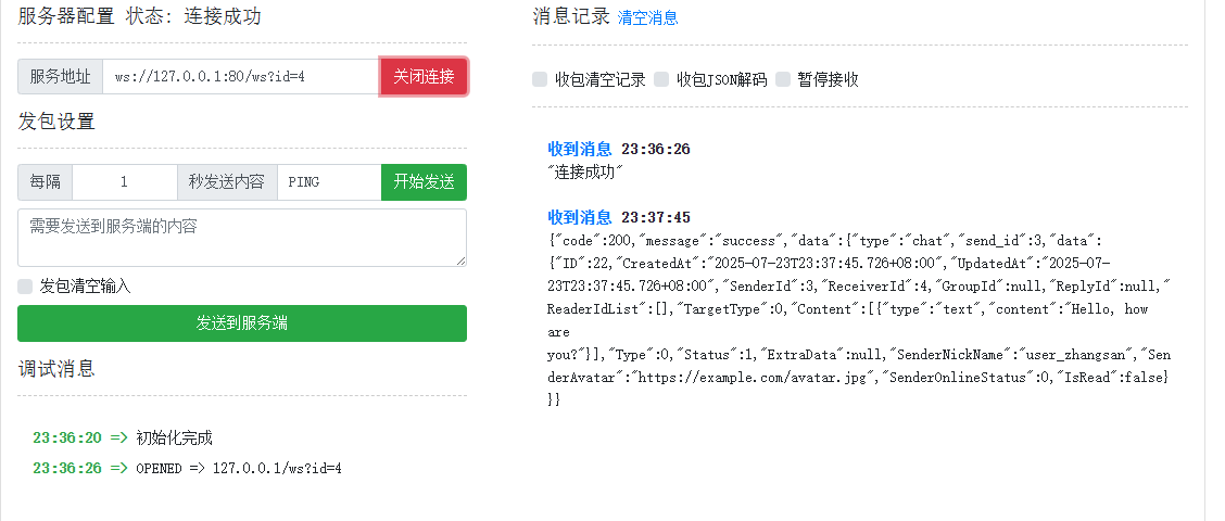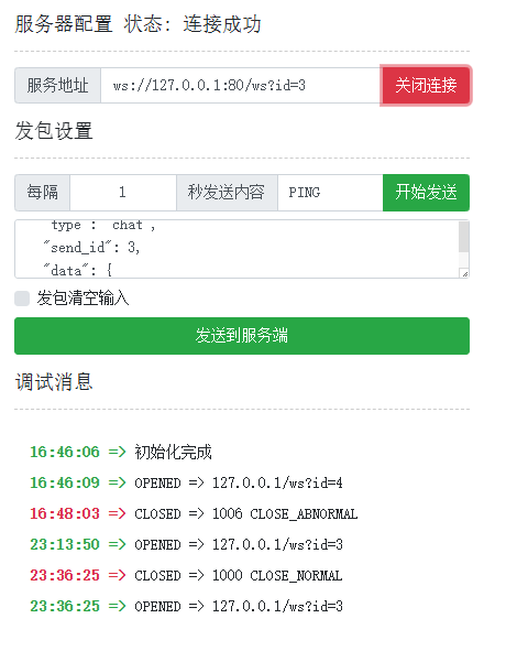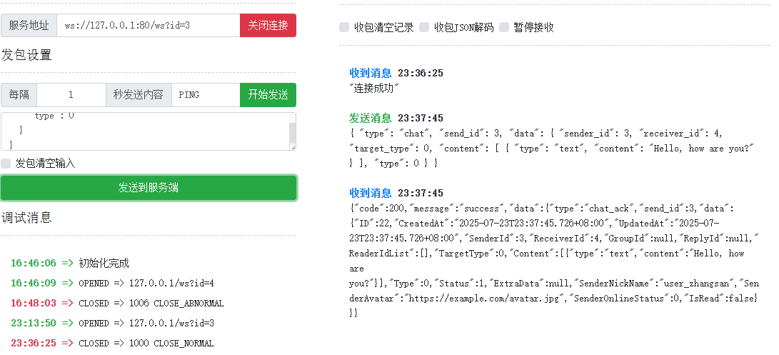 1.5.3 中已经展示出部分聊天消息的代码,可直接测试,随便找个ws测试网站开两个号