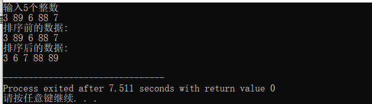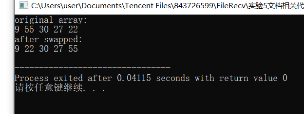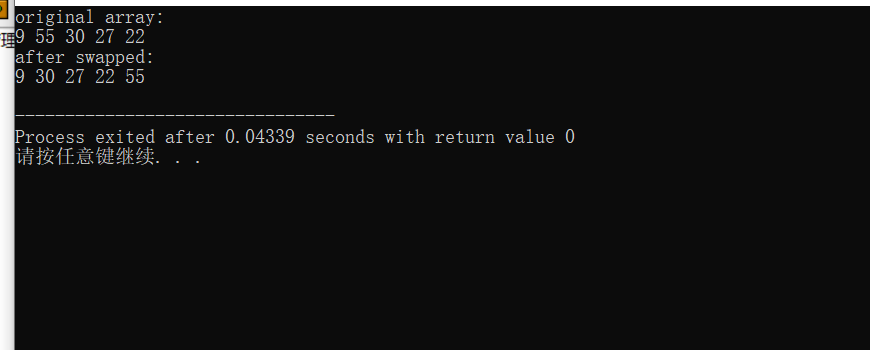 #include <stdio.h> #define N 5 void output(int x[], int n); int main() { int x[N] = {9, 55, 30, 27, 22}; int i; int t; // ÓÃ×÷½»»»Á½¸öÊý×éÔªËØµÄÖмä±äÁ¿ printf("original array:\n"); output(x, N); for(i=0; i<N-1; ++i) if(x[i] > x[i+1]) { t = x[i]; x[i] = x[i+1]; x[i+1] = t; } printf("after swapped:\n"); output(x, N); return 0; } void output(int x[], int n) { int i; for(i=0; i<n; ++i) printf("%d ", x[i]); printf("\n"); }