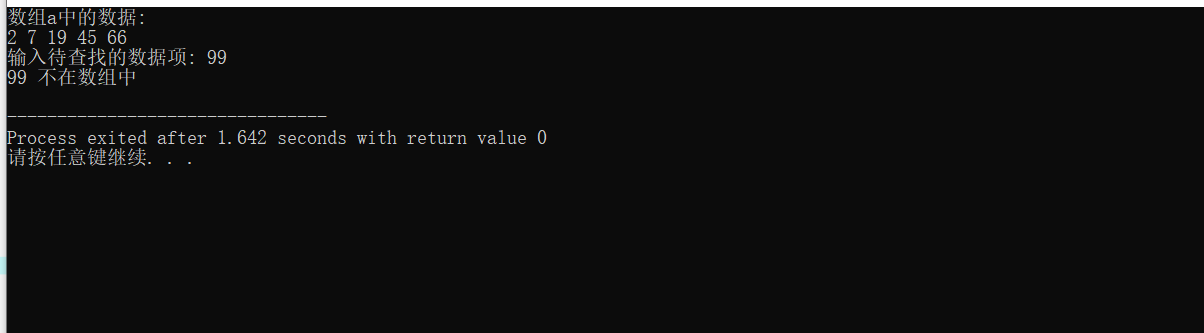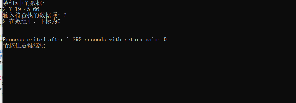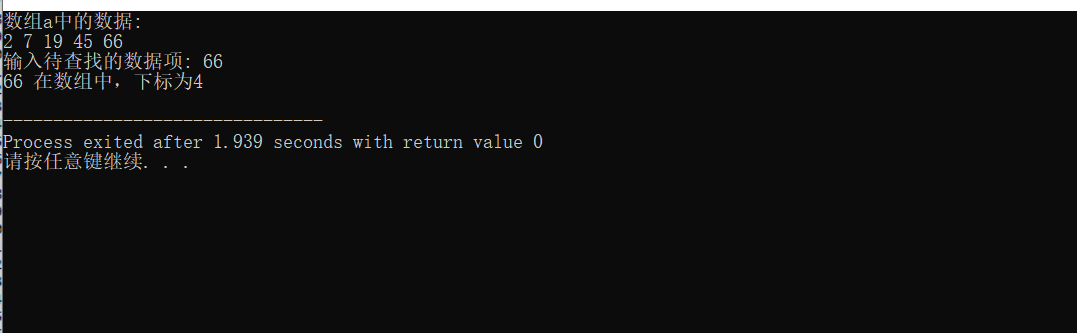 #include <stdio.h> #define N 5 int binarySearch(int x[], int n, int item); // º¯ÊýÉùÃ÷ int main() { int a[N] = {2, 7, 19, 45, 66}; int i, index, key; printf("Êý×éaÖеÄÊý¾Ý:\n"); for (i = 0; i < N; i++) printf("%d ", a[i]); printf("\n"); printf("ÊäÈë´ý²éÕÒµÄÊý¾ÝÏî: "); scanf("%d", &key); // µ÷Óú¯ÊýbinarySearch()ÔÚÊý×éaÖвéÕÒÖ¸¶¨Êý¾ÝÏîkey,²¢·µ»Ø²éÕÒ½á¹û¸øindex // ²¹×ã´úÂë¢Ù index=binarySearch(a,N,key); if (index >= 0) printf("%d ÔÚÊý×éÖУ¬Ï±êΪ%d\n", key, index); else printf("%d ²»ÔÚÊý×éÖÐ\n", key); return 0; } //º¯Êý¹¦ÄÜÃèÊö£º //ʹÓöþ·Ö²éÕÒËã·¨ÔÚÊý×éxÖвéÕÒÌØ¶¨Öµitem£¬Êý×éx´óСΪn // Èç¹ûÕÒµ½£¬·µ»ØÆäϱê // Èç¹ûûÕÒµ½£¬·µ»Ø-1 int binarySearch(int x[], int n, int item) { int low, high, mid; low = 0; high = n - 1; while (low <= high) { mid = (low + high) / 2; if (x[mid]==item) return mid; else if (x[mid]>item) high = mid - 1; else low = mid + 1; } return -1; }