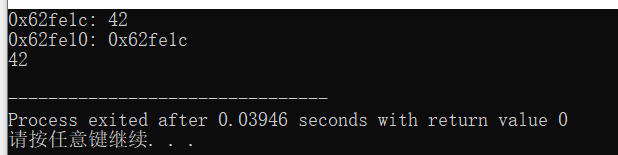 #include <stdio.h> int main() { int n; int *pn; n = 42; pn = &n; printf("%#x: %d\n", &n, n); printf("%#x: %#x\n", &pn, pn); printf("%d\n", *pn); return 0; }