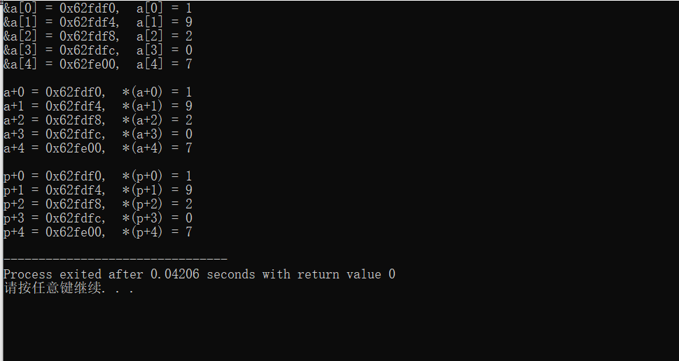 #include <stdio.h> #define N 5 int main() { int a[N] = {1, 9, 2, 0, 7}; int i; int *p; for(i=0; i<N; ++i) printf("&a[%d] = %#x, a[%d] = %d\n", i, &a[i], i, a[i]); printf("\n"); for(i=0; i<N; ++i) printf("a+%d = %#x, *(a+%d) = %d\n", i, a+i, i, *(a+i)); printf("\n"); p = a; for(i=0; i<N; ++i) printf("p+%d = %#x, *(p+%d) = %d\n", i, p+i, i, *(p+i)); return 0; }