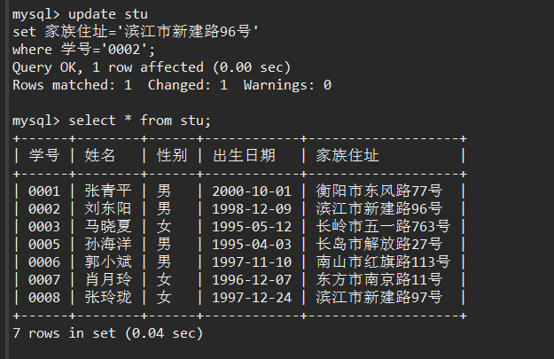 values('0001','张青平','男','2000-10-01','衡阳市东风路77号'),