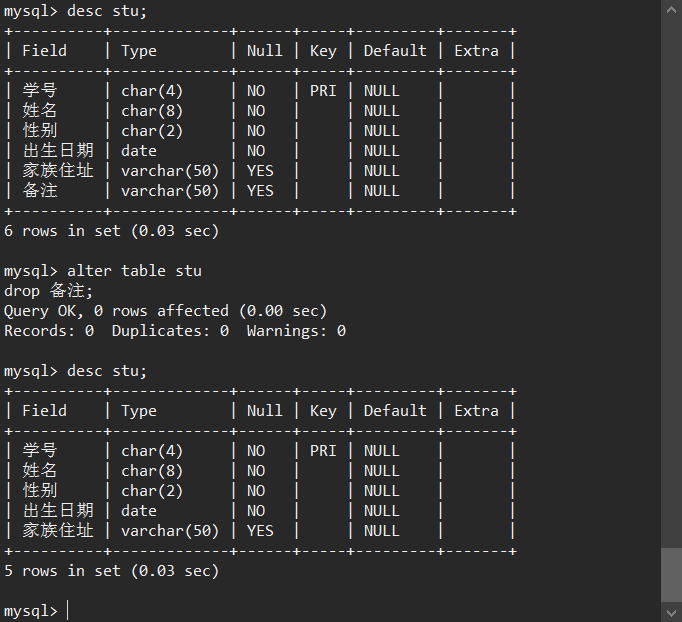 7删除表stud的“备注”列。
