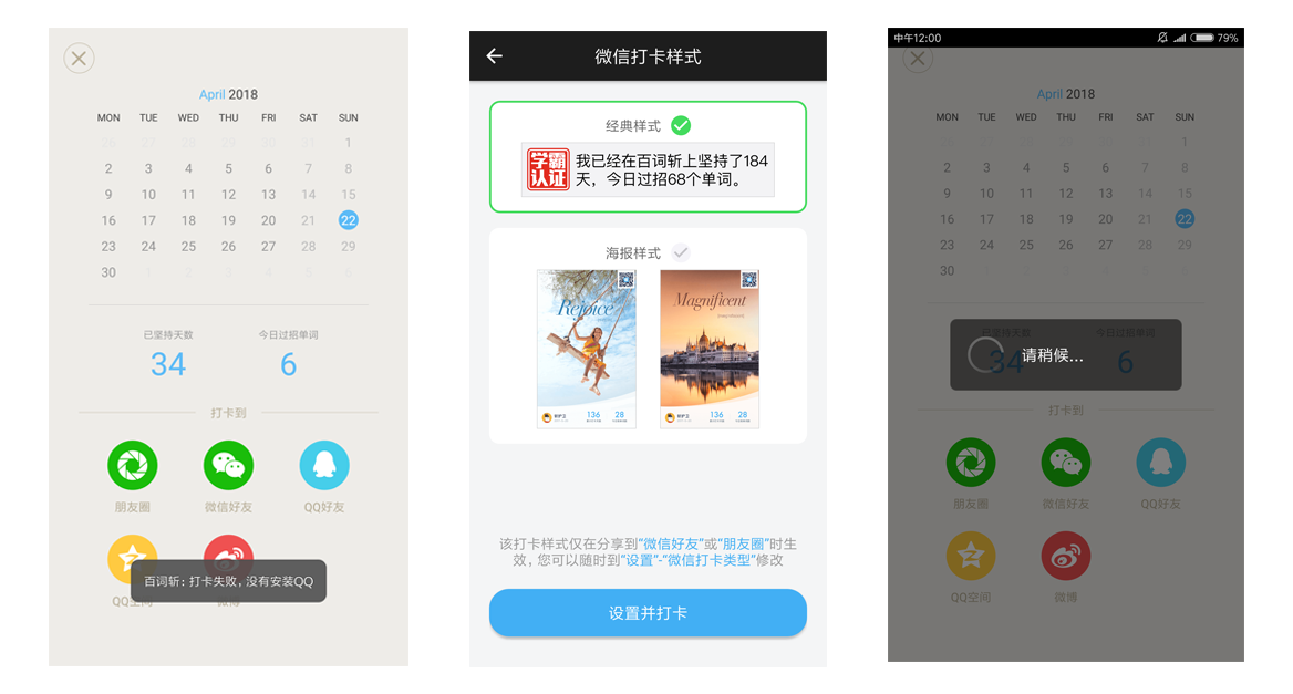 2.可可英语针对背单词,阅读,听力训练3个功能均设计了打卡记录功能,但体验可以说非常糟糕:体现在易用性差,用户在完成要求后可以打卡,但是当天退出APP后想要再次分享打卡记录变得十分复杂,其中背单词需要再背一个单元,阅读需要再读一篇文章,听力训练更是找不到哪里可以再次分享;分享平台不统一,三个打卡记录功能可分享的平台不一样,其中听力训练可以分享给QQ微信好友以及短信,而另外两个不可以,其中背单词打卡记录在无网络时,更是点击分享平台后没有任何提示或响应。