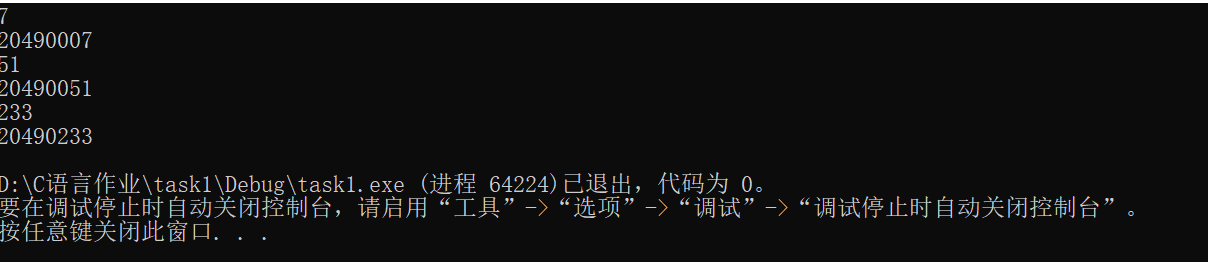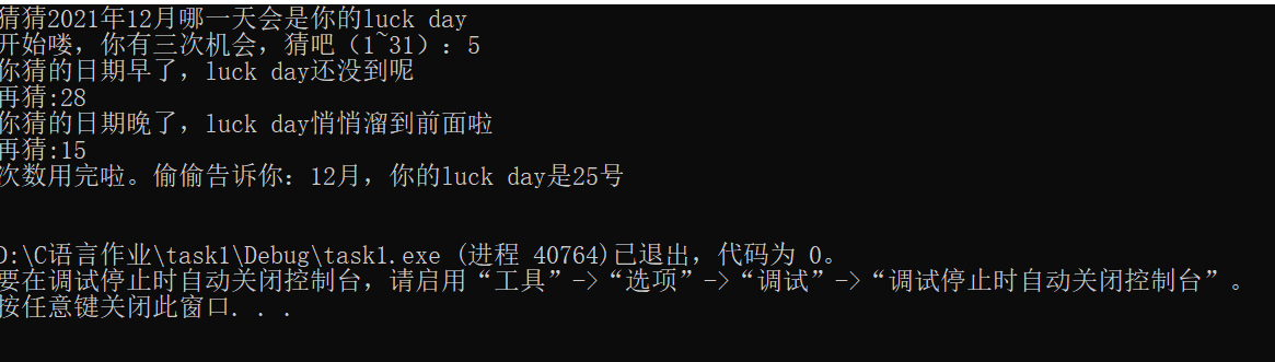 #include<stdio.h> #include<time.h> const int N = 1; int main() { int x, n; int q = 2; int s = 0; srand(time(0)); n = rand() % 32; printf("猜猜2021年12月哪一天会是你的luck day\n"); printf("开始喽,你有三次机会,猜吧(1~31):"); while (q--) { scanf("%d", &x); if (x == n) { printf("恭喜你,猜到了\n"); break; } else { if (x < n) printf("你猜的日期早了,luck day还没到呢\n"); else if (x > n) printf("你猜的日期晚了,luck day悄悄溜到前面啦\n"); printf("再猜:"); s = s++; } } if (s = 2) { scanf("%d", &x); if (x == n) printf("恭喜你,猜到了\n"); else printf("次数用完啦。偷偷告诉你:12月,你的luck day是%d号\n",n); } printf("\n"); return 0; }