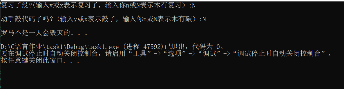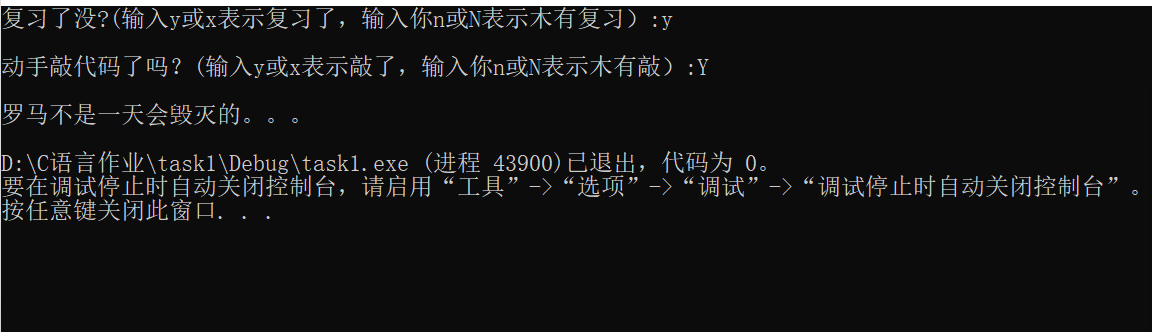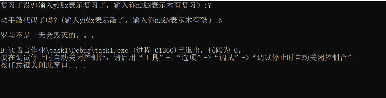 #include<stdio.h> int main(){ char ans1, ans2; printf("复习了没?(输入y或x表示复习了,输入你n或N表示木有复习):"); ans1 =getchar(); getchar(); printf("\n动手敲代码了吗?(输入y或x表示敲了,输入你n或N表示木有敲):"); ans2=getchar(); if(ans1==ans2=='y'||ans1==ans2=='Y') printf("\n罗马不是一天建成的:)\n"); else printf("\n罗马不是一天会毁灭的。。。\n"); return 0; }