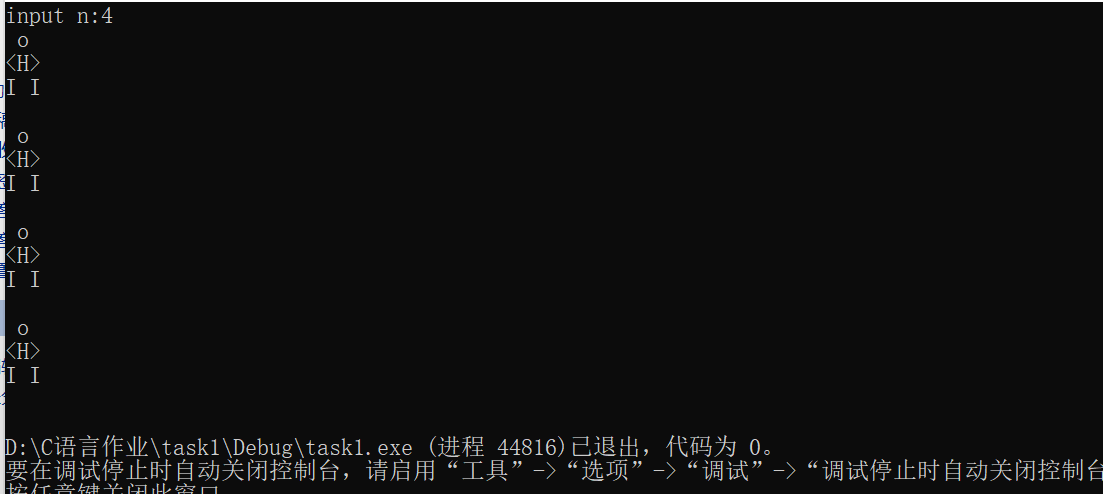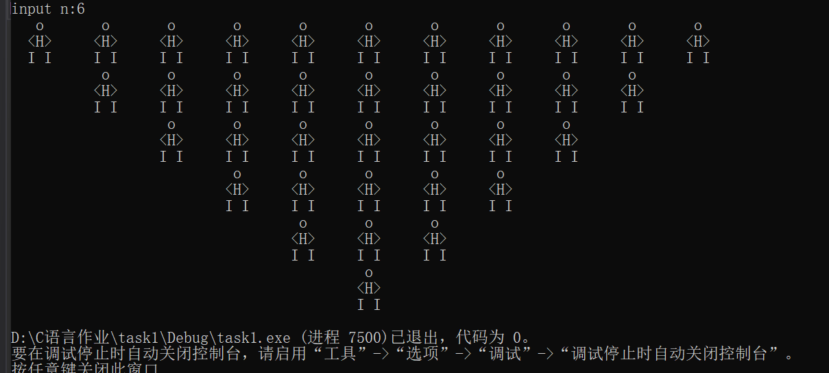 #include<stdio.h> int main() { int n,j,i; i = 0; printf("input n:"); scanf("%d", &n); while(n!=0) { for (j = 0; j < i; j++) printf("\t"); for (j = 0; j <2 * n - 1; j++) printf(" o \t"); printf("\n"); for (j = 0; j < i; j++) printf("\t"); for (j = 0; j< 2 * n - 1; j++) printf(" <H> \t"); printf("\n"); for (j = 0; j < i; j++) printf("\t"); for (j = 0; j < 2 * n - 1; j++) printf(" I I \t"); printf("\n"); n--; i++; } return 0; }