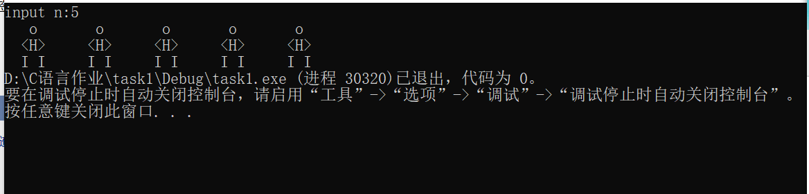 #include<stdio.h> int main() { int n,i; printf("input n:"); scanf("%d", &n); for (i = 0; i < n; i++) { printf(" o \t"); } printf("\n"); for (i = 0; i < n; i++) { printf(" <H> \t"); } printf("\n"); for (i = 0; i < n; i++) { printf(" I I \t"); } return 0; }