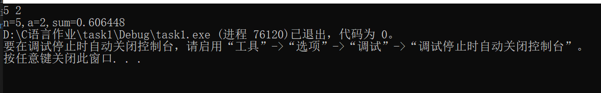 printf("n=%d,a=%d,sum=%lf", n, a, sum);