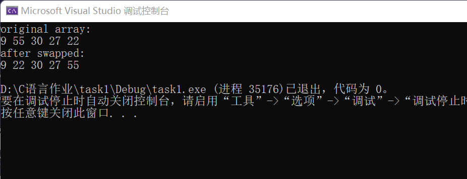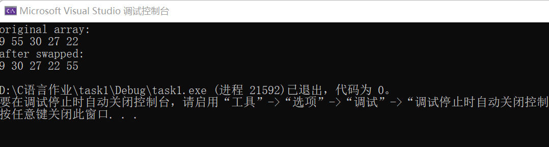 #include <stdio.h> #define N 5 void output(int x[], int n); int main() { int x[N] = { 9, 55, 30, 27, 22 }; int i; int t; printf("original array:\n"); output(x, N); for (i = 0; i < N - 1; ++i) if (x[i] > x[i + 1]) { t = x[i]; x[i] = x[i + 1]; x[i + 1] = t; } printf("after swapped:\n"); output(x, N); return 0; } void output(int x[], int n) { int i; for (i = 0; i < n; ++i) printf("%d ", x[i]); printf("\n"); }