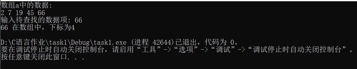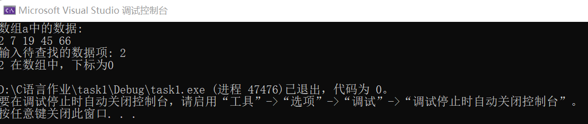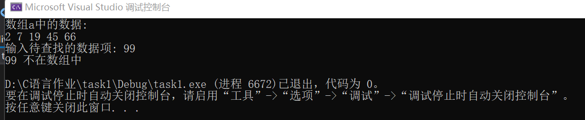 #include <stdio.h> #define N 5 int binarySearch(int x[], int n, int item); int main() { int a[N] = { 2, 7, 19, 45, 66 }; int i, index, key; printf("数组a中的数据:\n"); for (i = 0; i < N; i++) printf("%d ", a[i]); printf("\n"); printf("输入待查找的数据项: "); scanf("%d", &key); index = binarySearch(a, N, key); if (index >= 0) printf("%d 在数组中,下标为%d\n", key, index); else printf("%d 不在数组中\n", key); return 0; } int binarySearch(int x[], int n, int item) { int low, high, mid; low = 0; high = n - 1; while (low <= high) { mid = (low + high) / 2; if (item==x[mid]) return mid; else if (item<x[mid]) high = mid - 1; else low = mid + 1; } return -1; }
