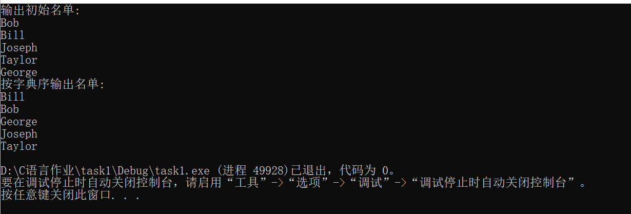 #include <stdio.h> #include <string.h> #define N 5 void selectSort(char str[][20], int n); int main() { char name[][20] = { "Bob", "Bill", "Joseph", "Taylor", "George" }; int i; printf("输出初始名单:\n"); for (i = 0; i < N; i++) printf("%s\n", name[i]); selectSort(name, N); printf("按字典序输出名单:\n"); for (i = 0; i < N; i++) printf("%s\n", name[i]); return 0; } void selectSort(char str[][20], int n) { int i, j, k; char temp[20]; for (i = 0; i < n ; i++) { k = i; for (j = i + 1; j < n; j++) if (strcmp(str[j] ,str[k])<0) { strcpy(temp, str[j]); strcpy(str[j], str[i]); strcpy(str[i], temp); } } }