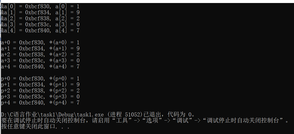 #include <stdio.h> #define N 5 int main() { int a[N] = {1, 9, 2, 0, 7}; int i; int *p; for(i=0; i<N; ++i) printf("&a[%d] = %#x, a[%d] = %d\n", i, &a[i], i, a[i]); printf("\n"); for (i = 0; i < N; ++i) printf("a+%d = %#x, *(a+%d) = %d\n", i, a + i, i, *(a + i)); printf("\n"); p = a; for (i = 0; i < N; ++i) printf("p+%d = %#x, *(p+%d) = %d\n", i, p + i, i, *(p + i)); return 0; }