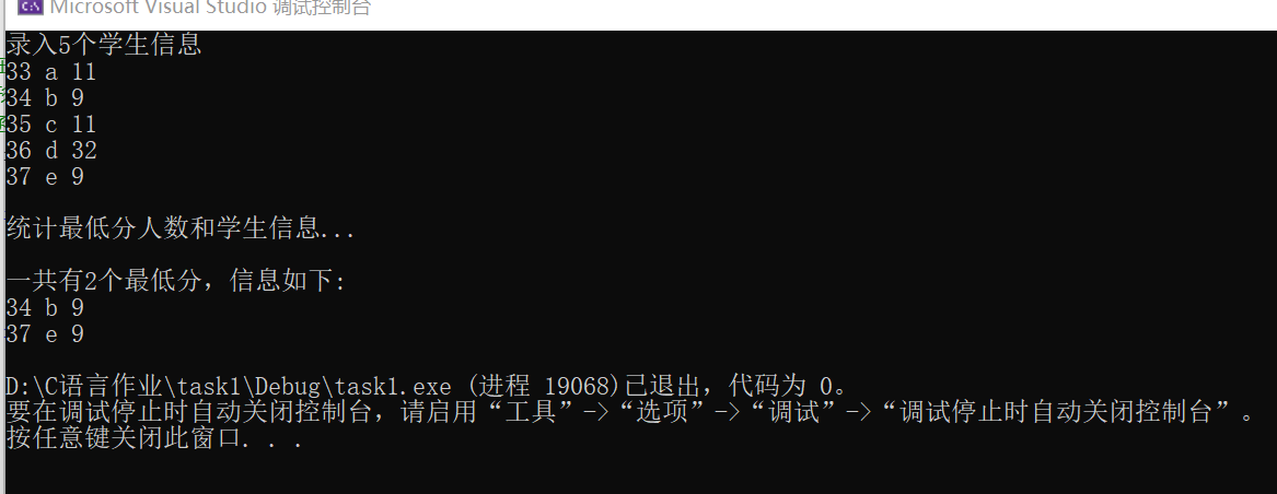 #include <stdio.h> #include <string.h> #define N 5 // 定义结构体类型struct student,并定义STU为其别名 typedef struct student { long no; char name[20]; int score; } STU; // 函数声明 void input(STU s[], int n); int findMinlist(STU s[], STU t[], int n); void output(STU s[], int n); int main() { STU stu[N], minlist[N]; int count; printf("录入%d个学生信息\n", N); input(stu, N); printf("\n统计最低分人数和学生信息...\n"); count = findMinlist(stu, minlist, N); printf("\n一共有%d个最低分,信息如下:\n", count); output(minlist, count); return 0; } // 输入n个学生信息,存放在结构体数组s中 void input(STU s[], int n) { int i; for (i = 0; i < n; i++) scanf("%ld %s %d", &s[i].no, s[i].name, &s[i].score); } // 输出结构体s中n个元素信息 void output(STU s[], int n) { int i; for (i = 0; i < n; i++) printf("%ld %s %d\n", s[i].no, s[i].name, s[i].score); } // 在结构体数组s中,查找最低分学生的记录,将其存入结构体数组t中 // 形参n是结构体数组s中元素个数 // 函数返回最低分的学生人数 int findMinlist(STU s[], STU t[], int n) { int i, j = 0, a = s[0].score; for (i = 0; i < n; i++) if (s[i].score < t) a = s[i].score; for (i = 0; i < n; i++) if (s[i].score == a) { t[j].no = s[i].no; strcpy( t[j].name , s[i].name); t[j].score = s[i].score; j++; } n = j; }