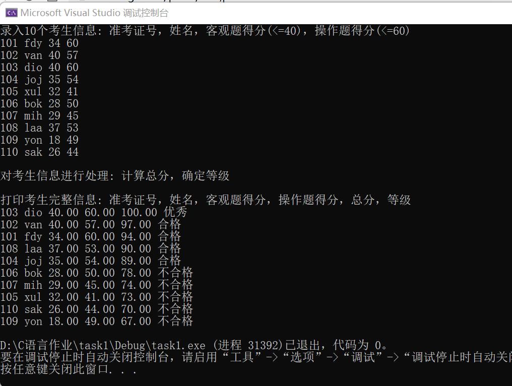 #include <stdio.h> #include <string.h> #define N 10 // 定义结构体类型struct student,并定义其别名为STU typedef struct student { long int id; char name[20]; float objective; /*客观题得分*/ float subjective; /*操作题得分*/ float sum; char level[10]; } STU; // 函数声明 void input(STU s[], int n); void output(STU s[], int n); void process(STU s[], int n); int main() { STU stu[N]; printf("录入%d个考生信息: 准考证号,姓名,客观题得分(<=40),操作题得分(<=60)\n", N); input(stu, N); printf("\n对考生信息进行处理: 计算总分,确定等级\n"); process(stu, N); printf("\n打印考生完整信息: 准考证号,姓名,客观题得分,操作题得分,总分,等级\n"); output(stu, N); return 0; } // 录入考生信息:准考证号,姓名,客观题得分,操作题得分 void input(STU s[], int n) { int i; for (i = 0; i < n; i++) scanf("%ld %s %f %f", &s[i].id, s[i].name, &s[i].objective, &s[i].subjective); } //输出考生完整信息: 准考证号,姓名,客观题得分,操作题得分,总分,等级 void output(STU s[], int n) { int i; for (i = 0; i < n; i++) printf("%ld %s %.2f %.2f %.2f %s\n", s[i].id, s[i].name, s[i].objective, s[i].subjective, s[i].sum,s[i].level); } // 对考生信息进行处理:计算总分,排序,确定等级 void process(STU s[], int n) { int i, j; STU f; for (i = 0; i < n; i++) s[i].sum = s[i].objective + s[i].subjective; for (i = 0; i < n; i++) { for (j = i + 1; j < n; j++) if (s[j].sum > s[i].sum) { f = s[i]; s[i] = s[j]; s[j]= f; } } for (i = 0; i < 0.1 * n; i++) strcpy(s[i].level , "优秀"); for (i = 0.1 * n; i < 0.5 * n; i++) strcpy(s[i].level ,"合格"); for (i = 0.5 * n; i < n; i++) strcpy(s[i].level ,"不合格"); }