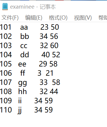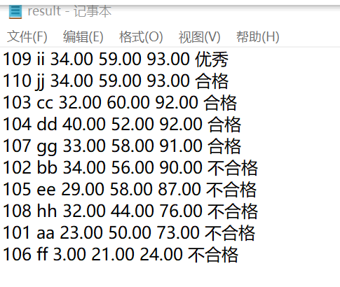 #include <stdio.h> #include <string.h> #define N 10 // 定义结构体类型struct student,并定义其别名为STU typedef struct student { long int id; char name[20]; float objective; /*客观题得分*/ float subjective; /*操作题得分*/ float sum; char level[10]; } STU; // 函数声明 void input(STU s[], int n); void output(STU s[], int n); void process(STU s[], int n); int main() { STU stu[N]; printf("录入%d个考生信息: 准考证号,姓名,客观题得分(<=40),操作题得分(<=60)\n", N); input(stu, N); printf("\n对考生信息进行处理: 计算总分,确定等级\n"); process(stu, N); printf("\n打印考生完整信息: 准考证号,姓名,客观题得分,操作题得分,总分,等级\n"); output(stu, N); return 0; } // 录入考生信息:准考证号,姓名,客观题得分,操作题得分 void input(STU s[], int n) { FILE *fp1; int i; fp1=fopen("examinee.txt","r"); for(i=0;i<n;i++){ fscanf(fp1,"%ld %s %f %f",&s[i].id,s[i].name,&s[i].objective,&s[i].subjective); } fclose(fp1); } // 输出考生完整信息: 准考证号,姓名,客观题得分,操作题得分,总分,等级 // 不仅输出到屏幕上,还写到文本文件result.txt中 void output(STU s[], int n) { FILE *fp2; int i; fp2=fopen("result.txt","w"); for(i=0;i<n;i++){ fprintf(fp2,"%ld %s %.2f %.2f %.2f %s\n",s[i].id,s[i].name,s[i].objective,s[i].subjective,s[i].sum,s[i].level); printf("%ld %s %.2f %.2f %.2f %s\n",s[i].id,s[i].name,s[i].objective,s[i].subjective,s[i].sum,s[i].level); } fclose(fp2); } // 对考生信息进行处理:计算总分,排序,确定等级 void process(STU s[], int n) { int i, j; STU f; for (i = 0; i < n; i++) s[i].sum = s[i].objective + s[i].subjective; for (i = 0; i < n; i++) { for (j = i + 1; j < n; j++) if (s[j].sum > s[i].sum) { f = s[i]; s[i] = s[j]; s[j] = f; } } for (i = 0; i < 0.1 * n; i++) strcpy(s[i].level, "优秀"); for (i = 0.1 * n; i < 0.5 * n; i++) strcpy(s[i].level, "合格"); for (i = 0.5 * n; i < n; i++) strcpy(s[i].level, "不合格"); }