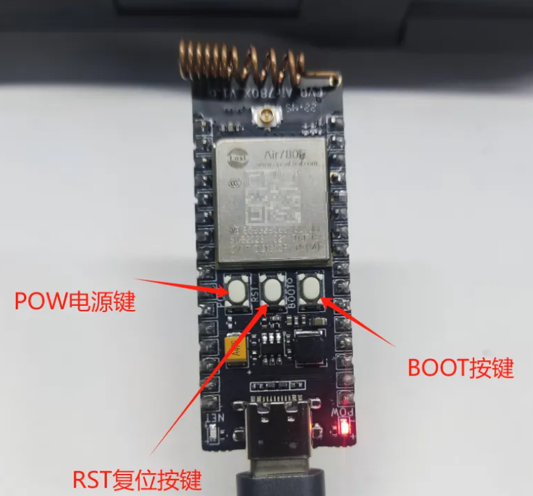 开发板处于未开机状态:此时先按住下载模式按键(BOOT 键)不放,再长按开机键(POW 键)开机,若不出意外开发板将会进入下载模式,Luatools 工具下载进度条会开始跑,这时便可以松开 BOOT 键和 POW 键,等到工具提示下载完成即可。