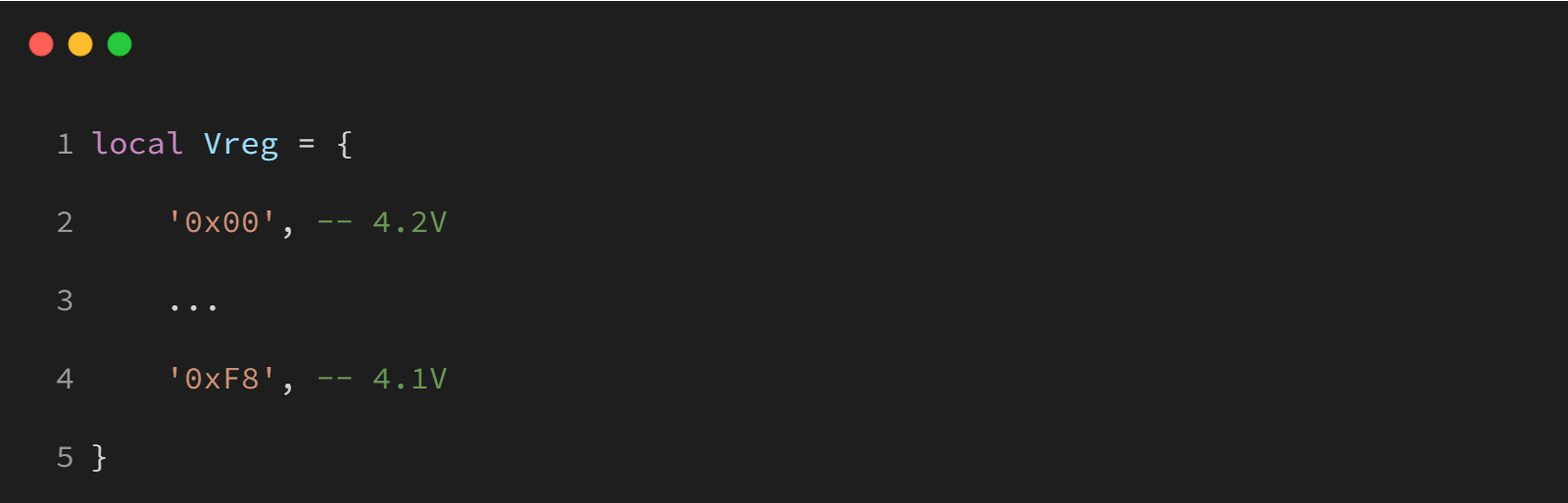 读取 V_CTRL 寄存器并设置电池上限电压。如果操作成功,将会再次读取配置寄存器并确认设置结果,记录相关的日志信息。 参数说明:gpio_pin 是传感器对应引脚,0x04 是芯片设备 ID 号,0x00 是 V_CTRL 寄存器地址,0x00 是设置电池上限电压为 4.2V,可参考下方表格。