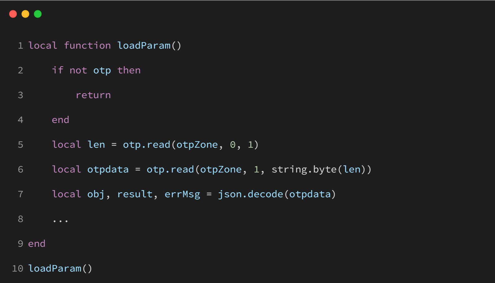 loadParam 函数首先检查 OTP 是否存在,然后读取 OTP 存储区中的数据,解码 JSON 格式的数据以获取硬件版本号和出厂测试结果。若解码失败或缺少数据,则根据设备型号进行版本号的设置。
