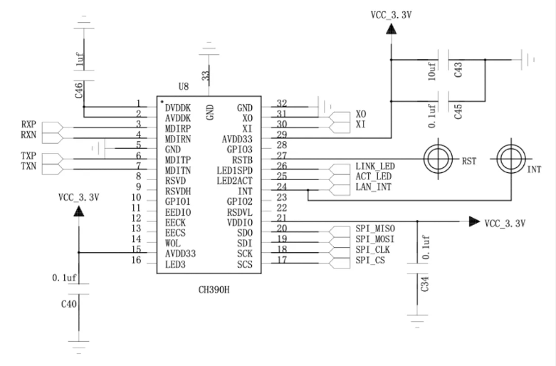 同时支持WAN和LAN功能,则需要预留两路RJ45接口电路(包括两个CH390H)。