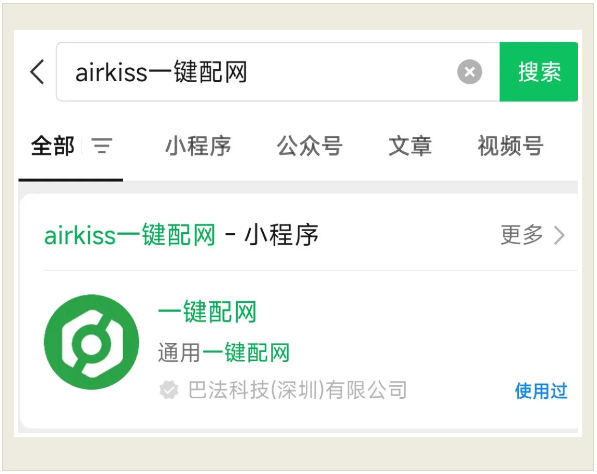 1)微信搜索“airKiss一键配网”,本教程使用的是巴法云的Airkiss配网功能: