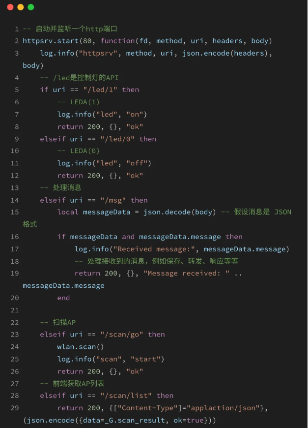 可以在网页通过HTTP请求控制LED的开关、发送任意消息、扫描可用的Wi-Fi网络、获取AP列表,以及连接到新的Wi-Fi网络。