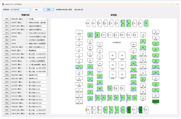 基于此,我们设计了可视化GPIO配置工具—— LuatIO由此工具生成对应的"pins_$model.json"文件,结合API库函数pins动态配置,最后以脚本的形式下载到模组中,即可完成该模组型号的GPIO复用配置。