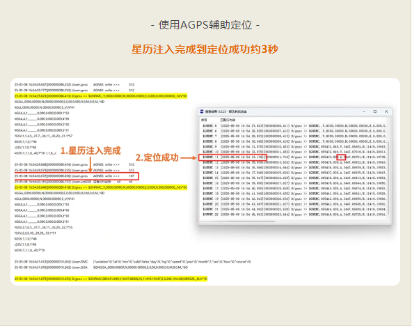 没有使用AGPS辅助定位,需要31秒左右才能定位成功;使用AGPS后,注入星历数据后3秒左右就能定位成功。