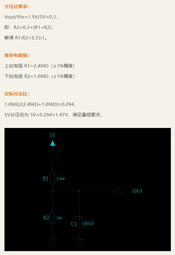 当被测电压大于3.6V时,被测电压需先经过外部电阻分压,且经过分压后接在ADC的电压值需小于1.5V。