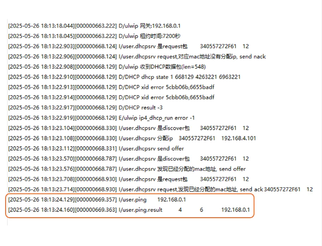 烧录代码后,在LuaTools日志打印中我们可以看到以太网的相关打印,当日志输出以太网初始化完成,则说明以太网准备就绪。