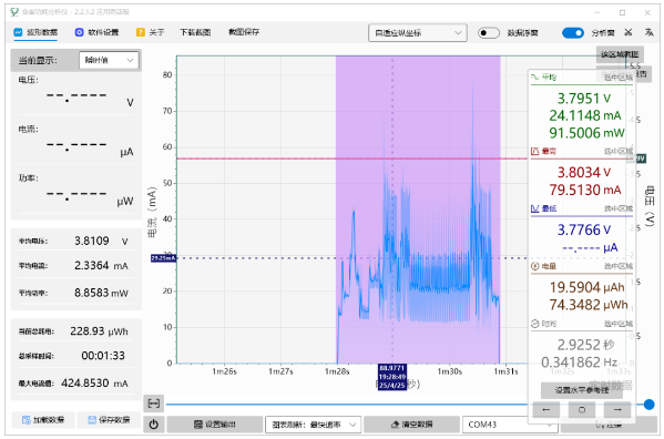 下图红框内为收到服务器下发数据时的功耗数据,可以看出从唤醒到收到服务器数据总计花费约5秒,平均电流约为23.7mA: