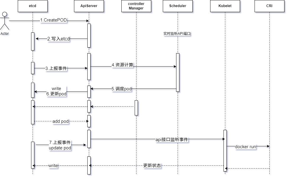运行在每个工作节点上的kubelet也会定期与api-server同步bound Pod的信息,一旦发现在该工作节点上运行的bound Pod对象没有更新,则调用Docker API创建并启动pod内的容器.