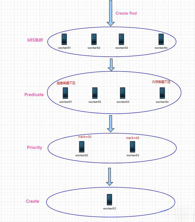 其次,对第一步筛选出的符合要求的主机进行打分,这个过程称为 priority,在此阶段,如果在 predicate过程中没有合适的节点,Pod 会一直处于pending状态,不断重试调度,直到有节点满足条件。