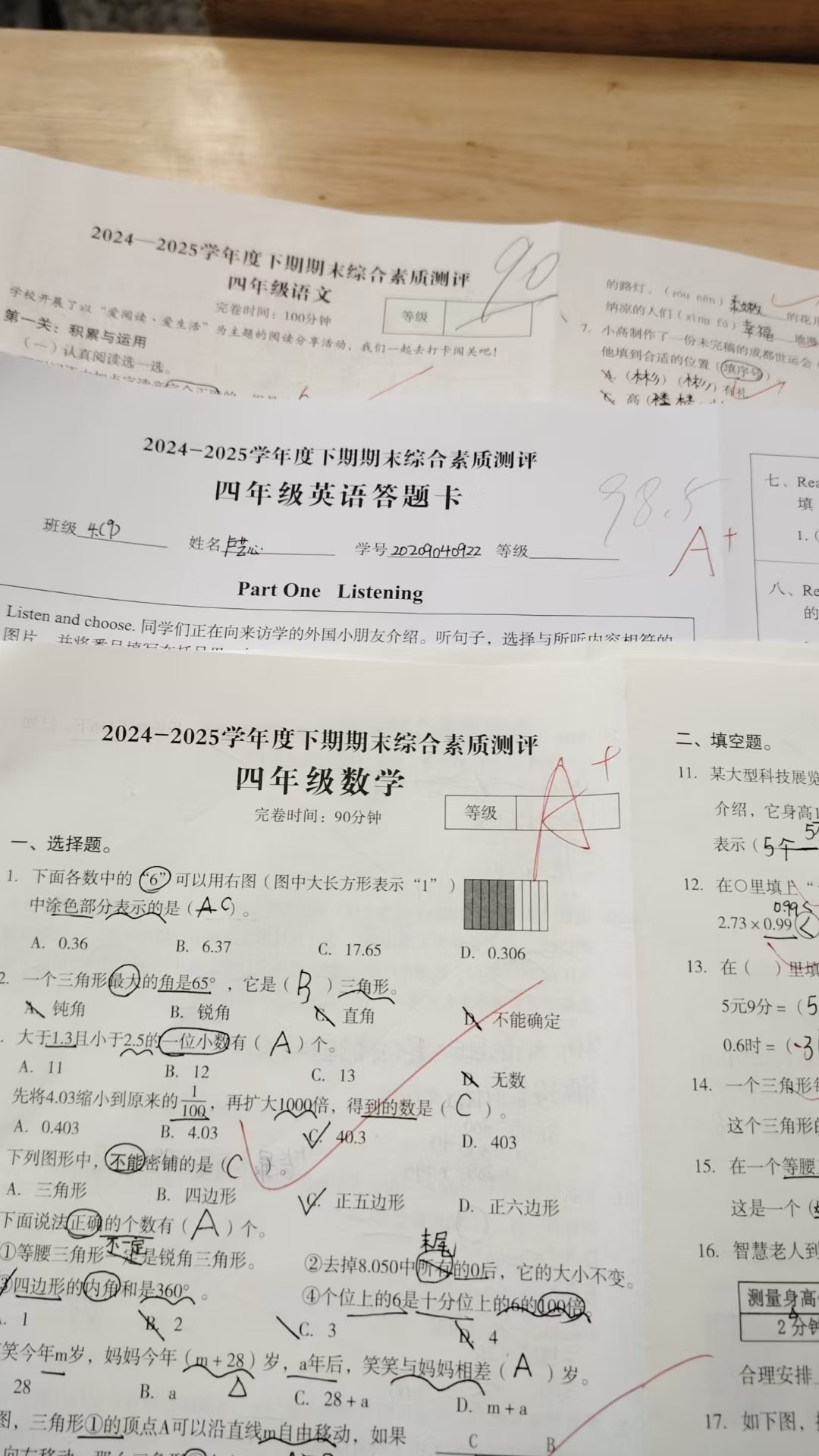 新一月启动,看四年级成绩单,100/98.5/90 数英语 集体上优是好事。