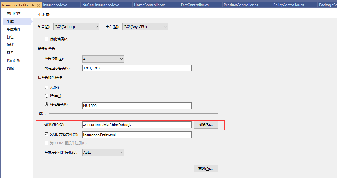 由于mvc项目引用了Entity类库,Entity类库中有很多Dto类,Dto有很多注释,此时对Entity项目进行以上操作,但注意的是,一定要使Entity项目的xml文档输出路径与mvc项目的输出路径一致,这样在Startup类的ConfigureServices中方便找出