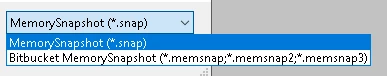 使用“Import snapshot file”对话框右下角的文件格式下拉列表,选择要导入的内存快照的格式。 选项包括使用Memory Profiler捕获的.snap文件和使用Bitbucket Memory Profiler捕获的.memsnap *。