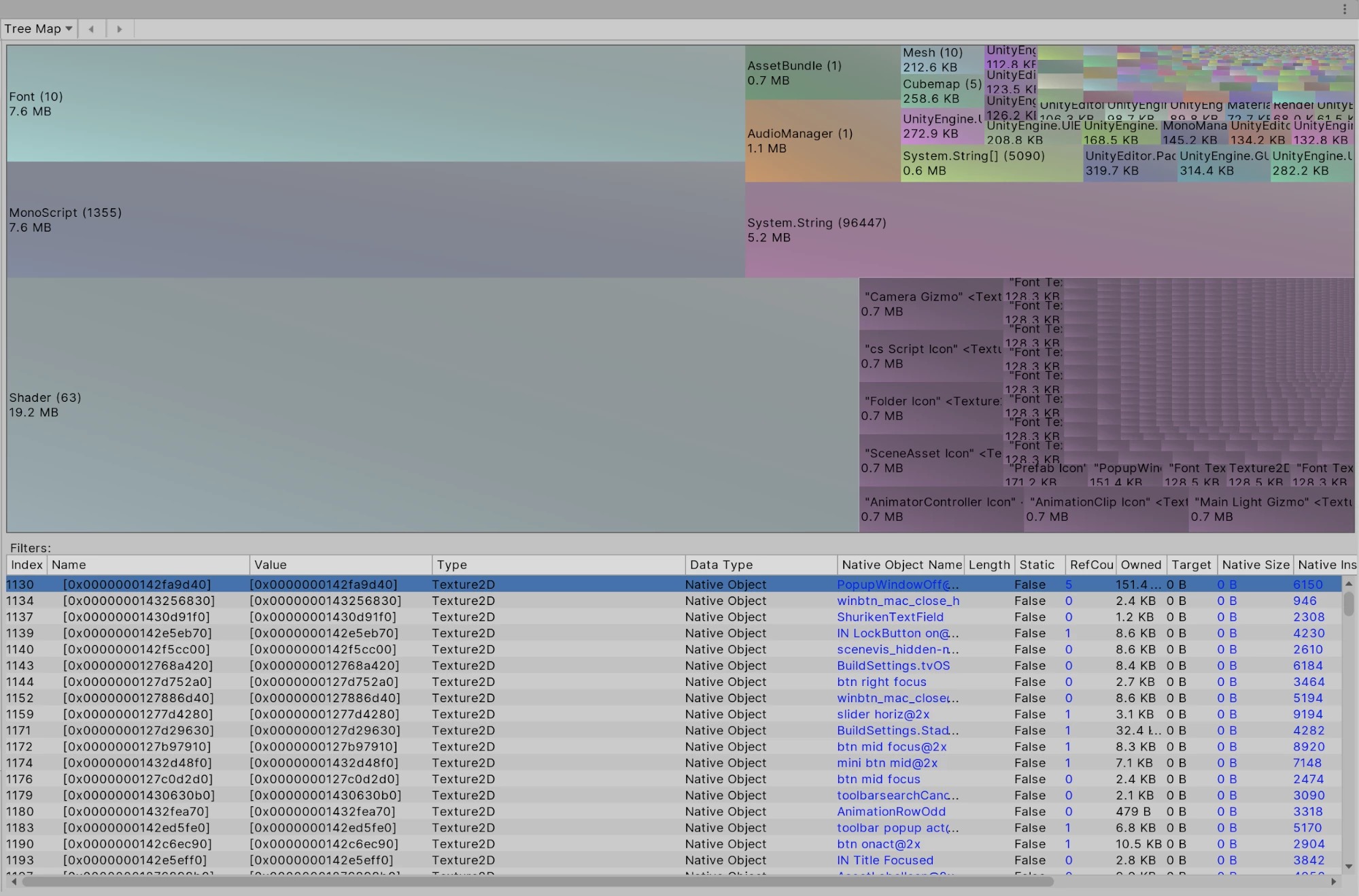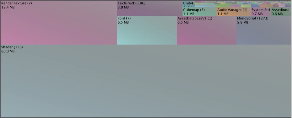 默认和最直观的视图是树形图(下图)。 在此视图中,每种元素类型使用的内存量均按比例表示。 在我们的示例中,126个着色器共同消耗80 MB的内存。
