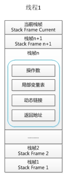 栈中存储的是栈帧。每个方法在执行时都会创建一个栈帧。栈帧中存储了局部变量表、操作数栈、动态连接和方法出口等信息。每个方法从调用到运行结束的过程,就对应着一个栈帧在栈中压栈到出栈的过程。可以理解为栈帧就是线程所执行的方法。
